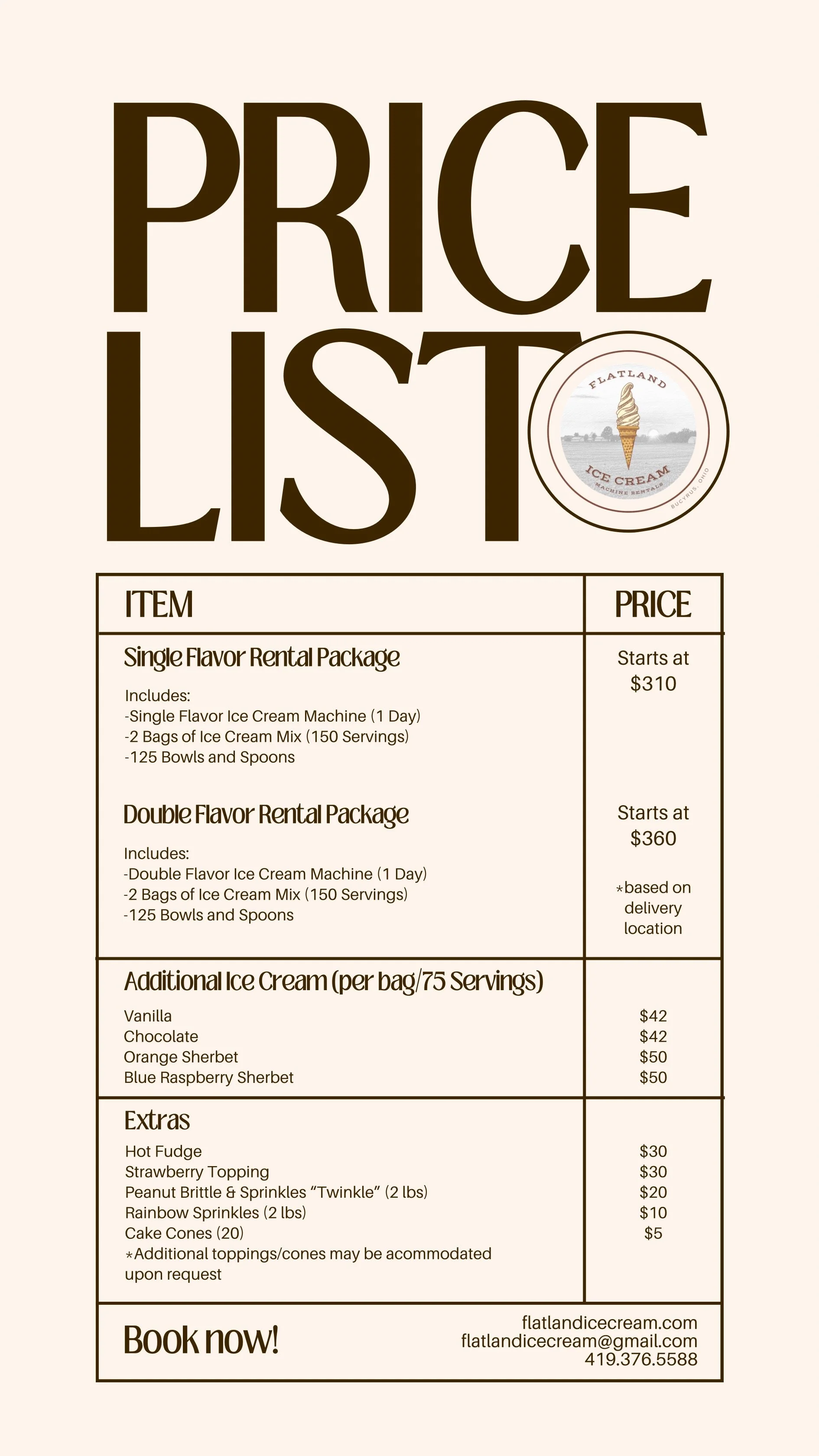 At Flatland Ice Cream Machine Rentals, we specialize in providing high-quality commercial single and double flavor Taylor soft serve ice cream machines for all your events and parties in North Central Ohio. Our mission is to make your next event a little sweeter!